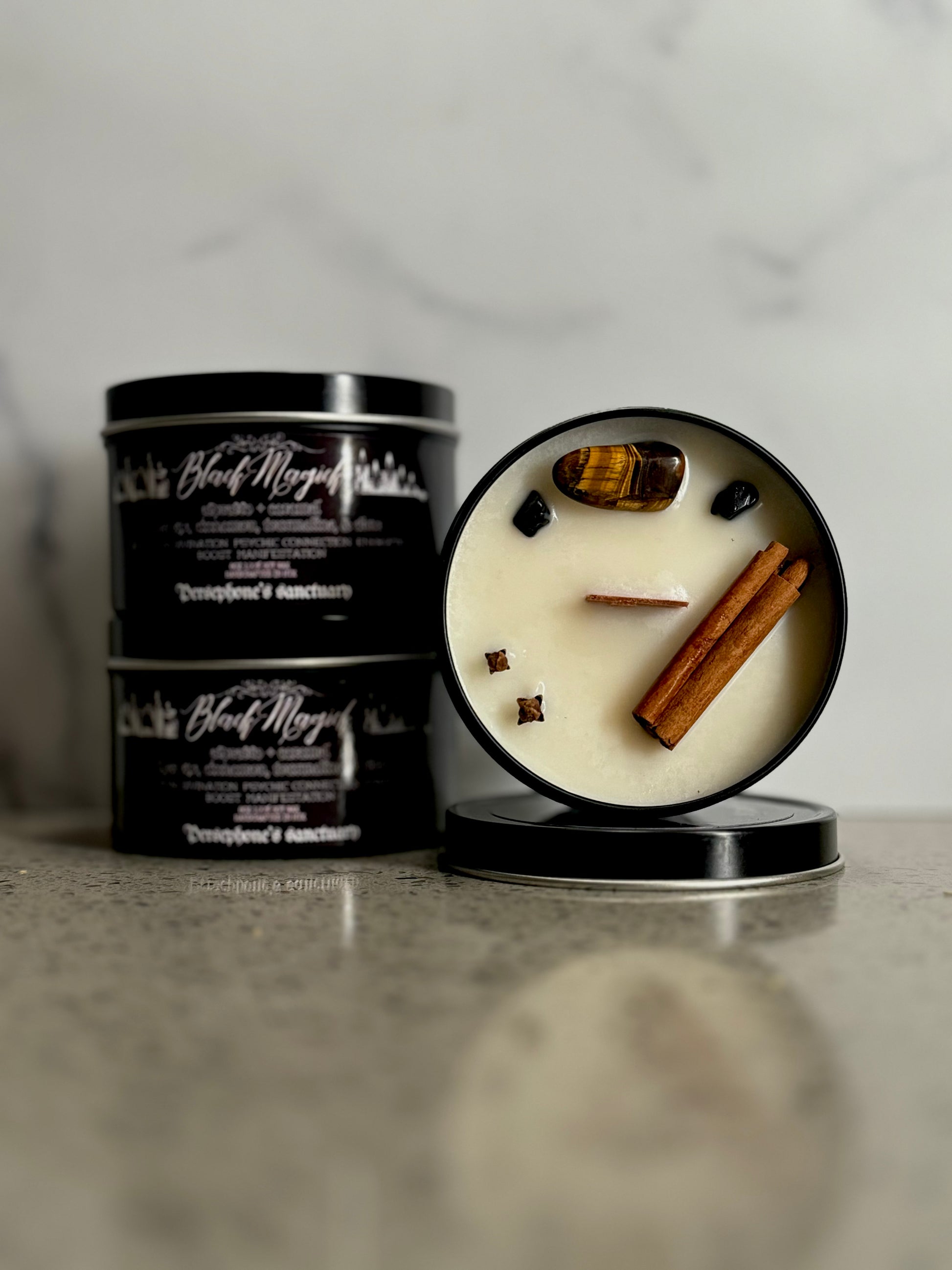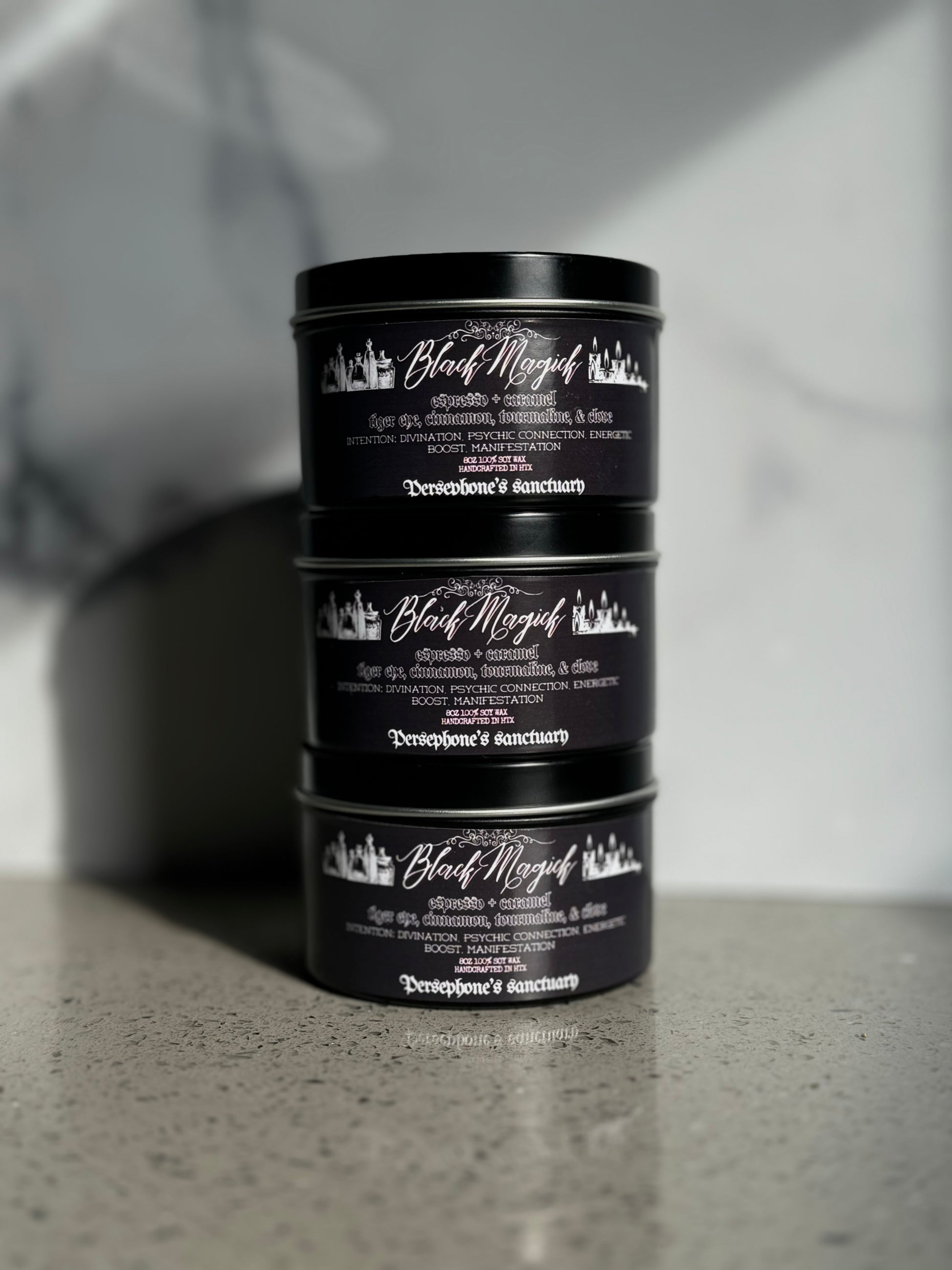 Black Magick is made and packaged with perfect love and intention. This 100% soy based candle contains: