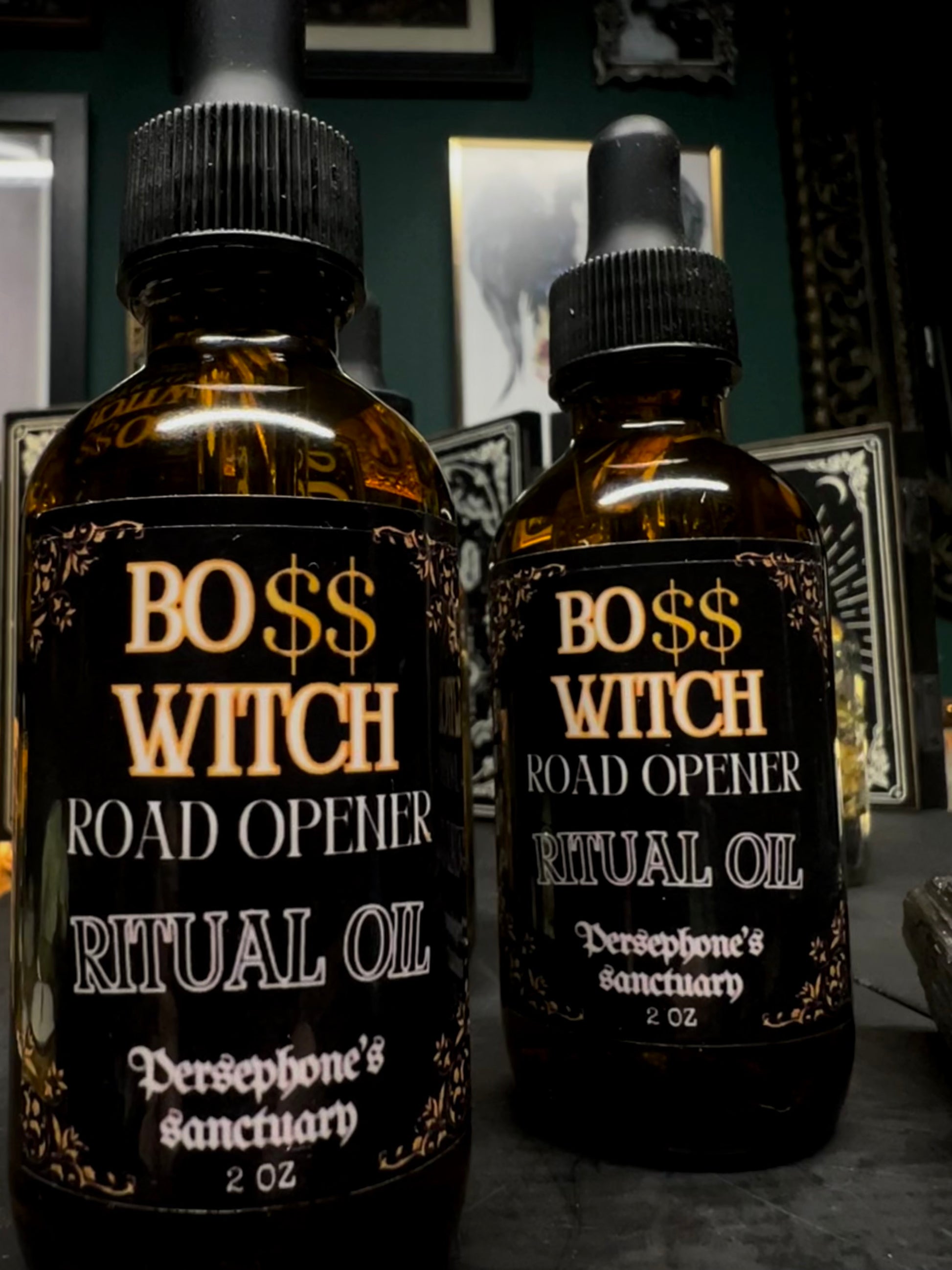 The Bo$$ Witch Road Opener Oil is the perfect addition to almost any spell. Anoint your tools, candles, and self with this oil for a boost of luck and power.