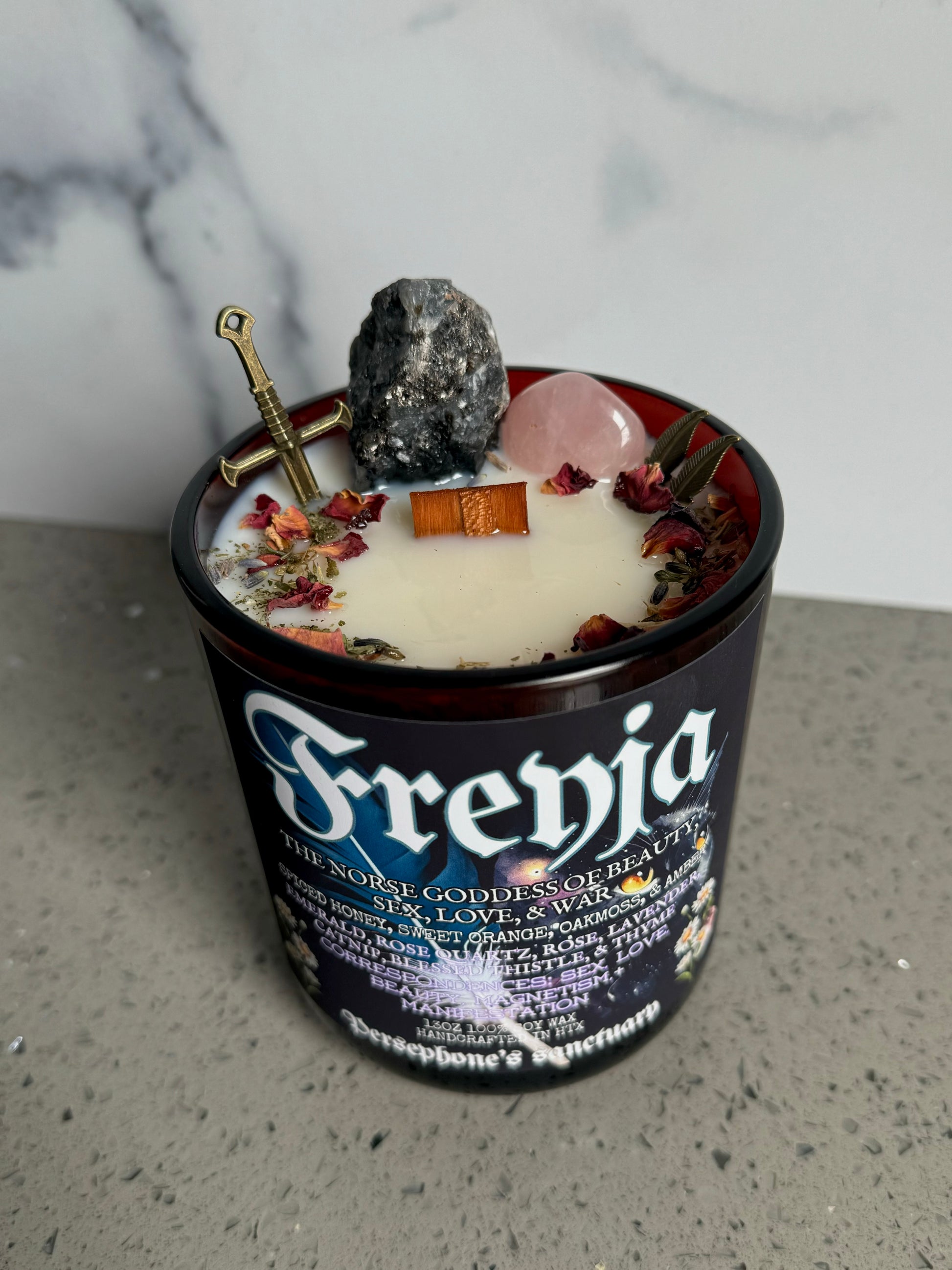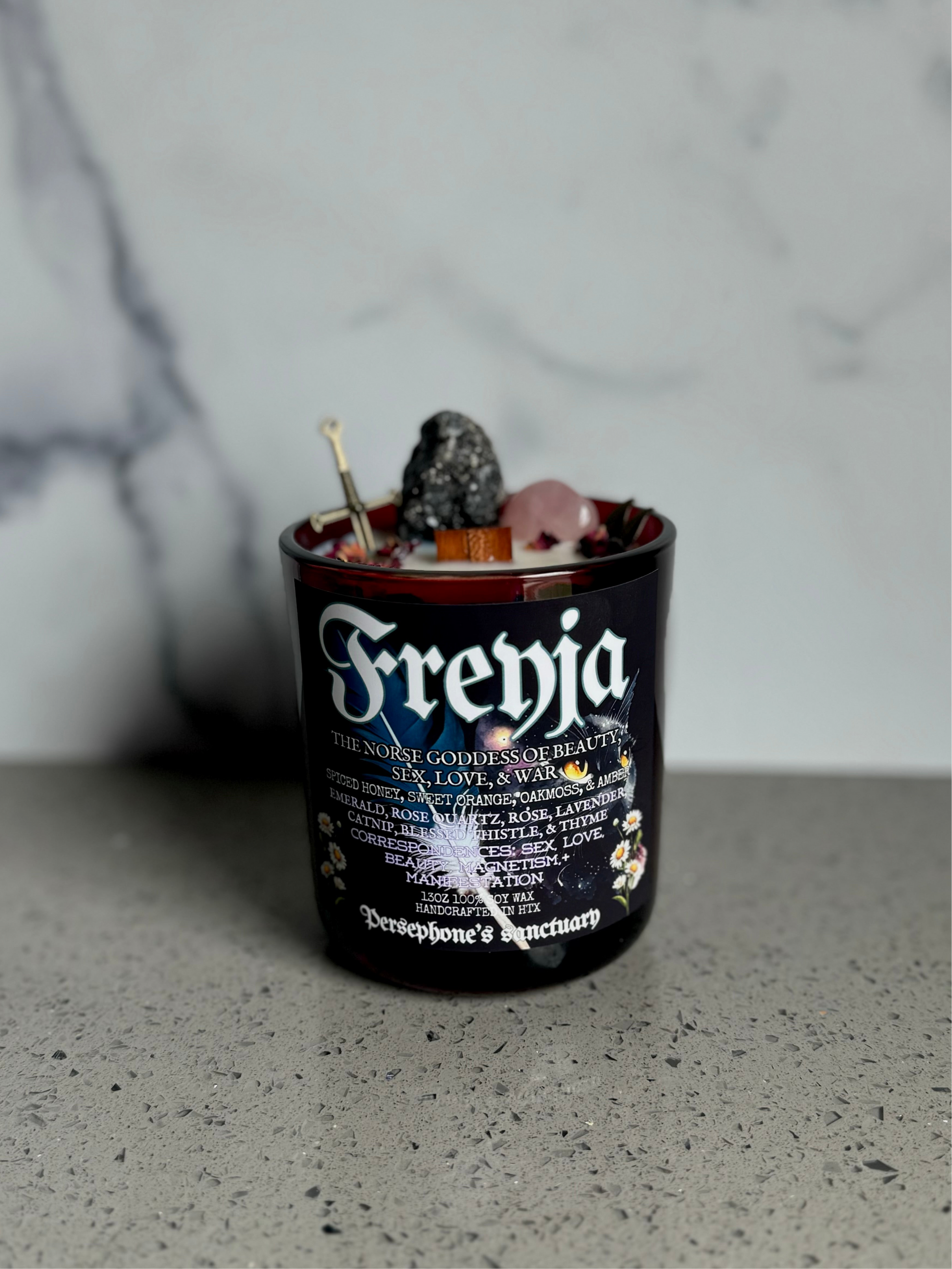 Freyja is made and packaged with perfect love and intention. This 100% soy based candle contains: