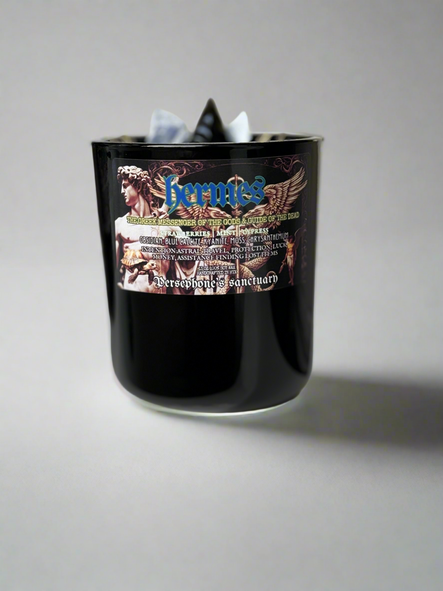 Adorning this candle are exquisite crystals that elevate its mystical allure. Obsidian, known for its protective qualities, shields your space with its powerful energy. Blue calcite soothes the mind and encourages clarity, while kyanite fosters communication and harmony. Together, these crystals create a sacred synergy that enhances the ambiance, making the Hermes God Candle not only a sensory experience but also a spiritual one. Light this candle to invoke the presence of Hermes and let its captivating fragrance and the energy of its crystals guide you on a path of inspiration and insight.