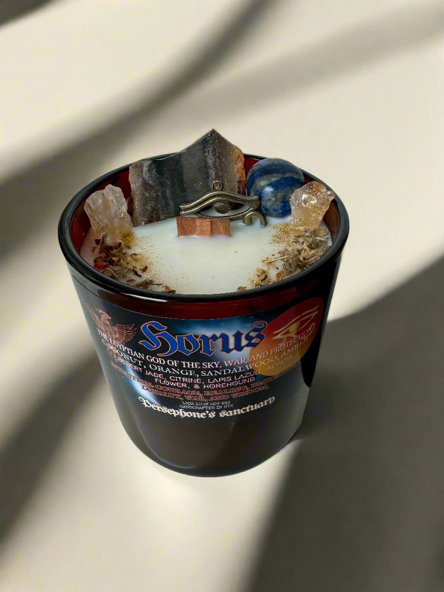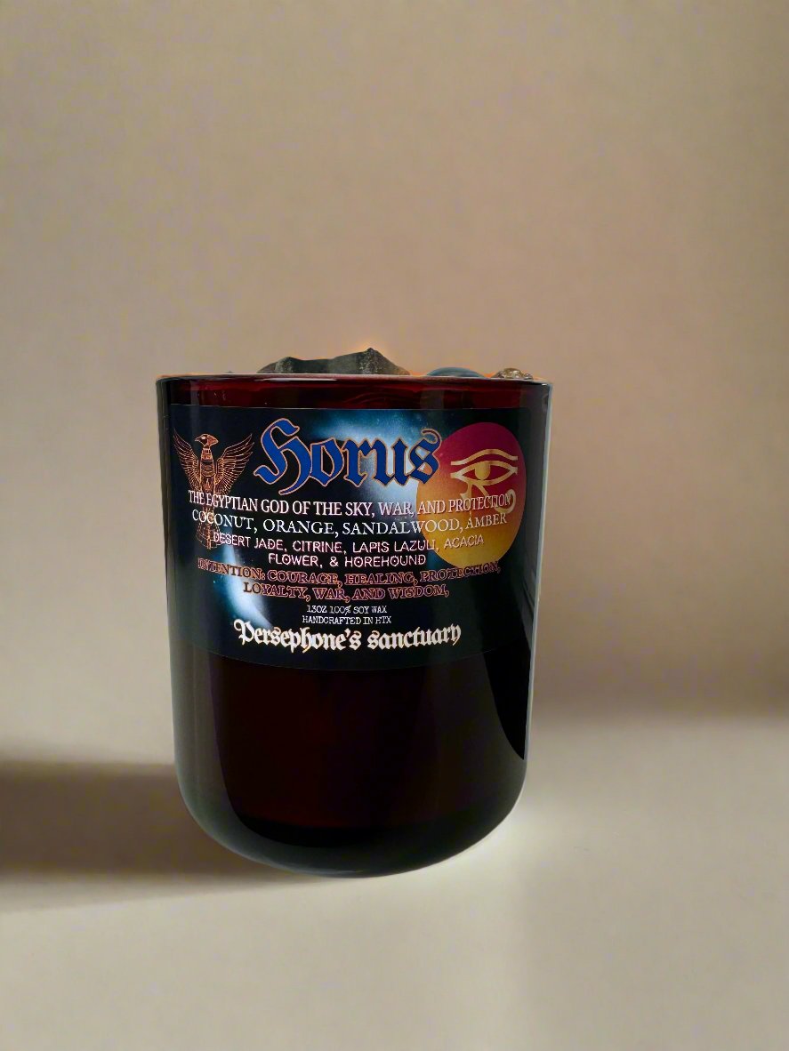 Crafted to honor the God Horus, this candle combines fragrant sandalwood and rich amber& myrrh for a divine sensory experience. Let the warm glow and delicate scents transport you to a sacred place. Expertly crafted for a truly immersive experience.