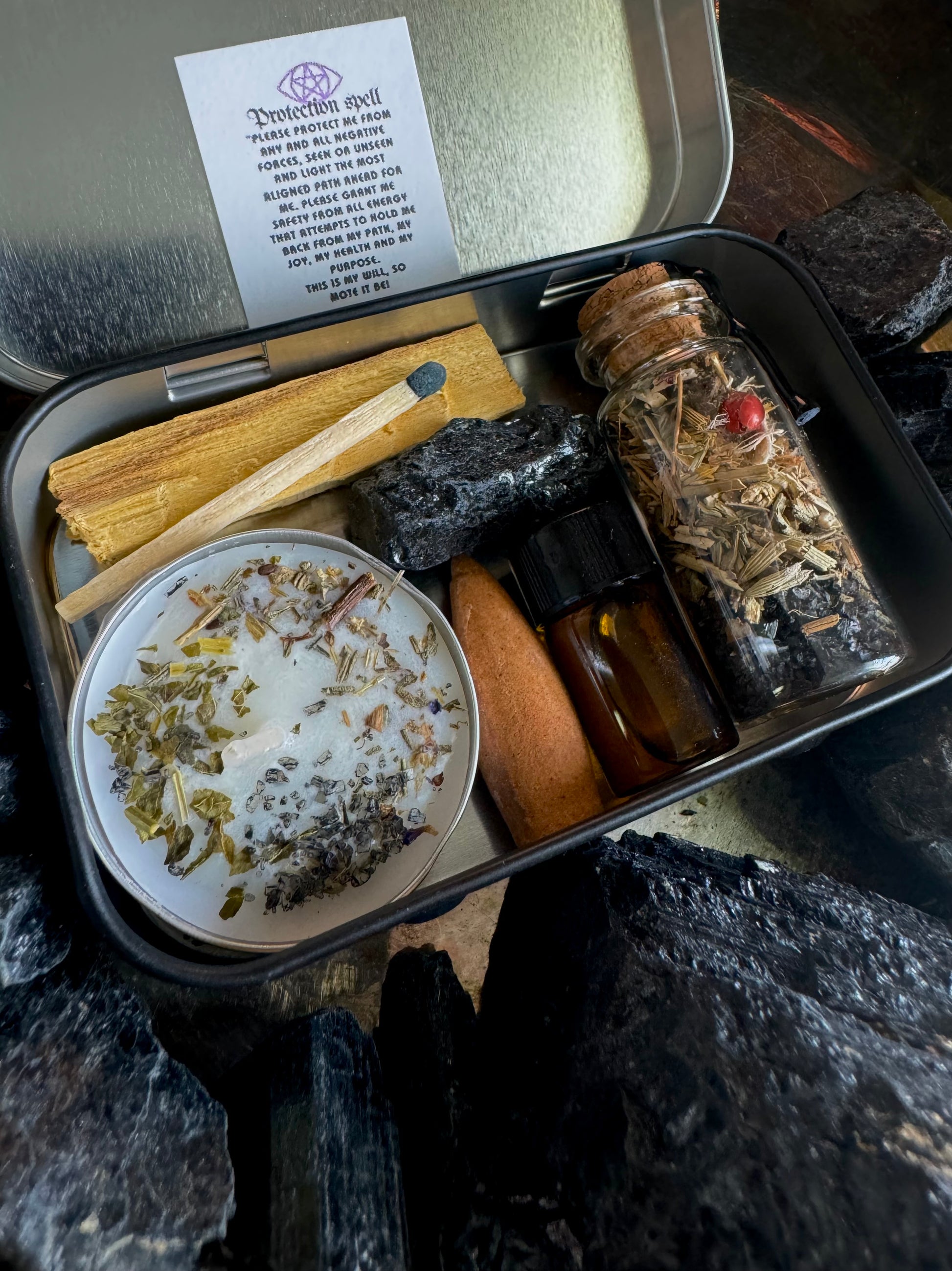 Each kit contains everything you need to protect against energy vampires and caca vibes along with a Palo Santo stick to draw in positive energy.