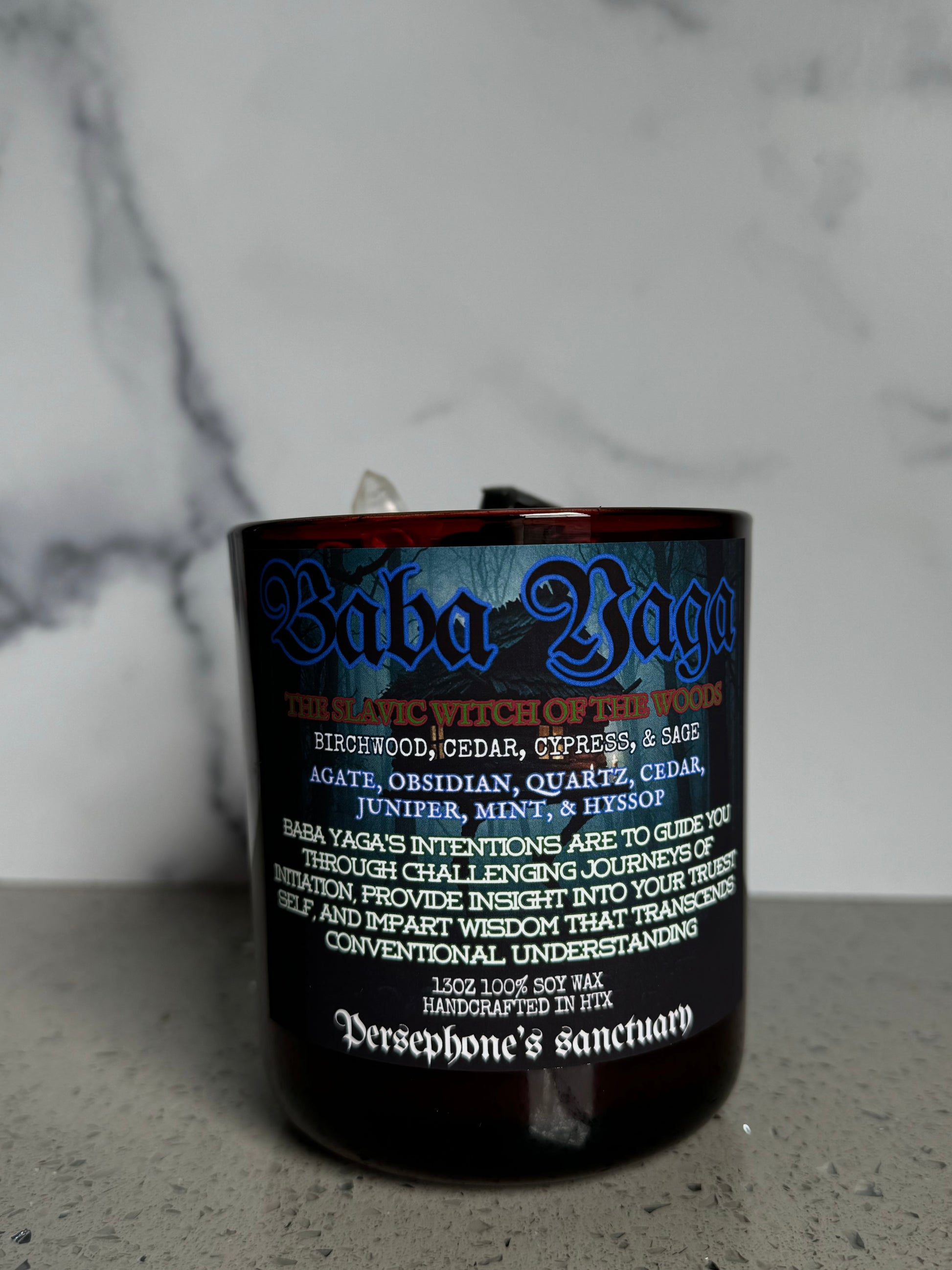 Baba Yaga is an intriguing character from Slavic folklore, known for her mysterious and unpredictable nature. The Baba Yaga candle is a wonderful tribute to this enigmatic figure, featuring a unique blend of scents that capture her magickal little chicken legged hut’s essence perfectly.