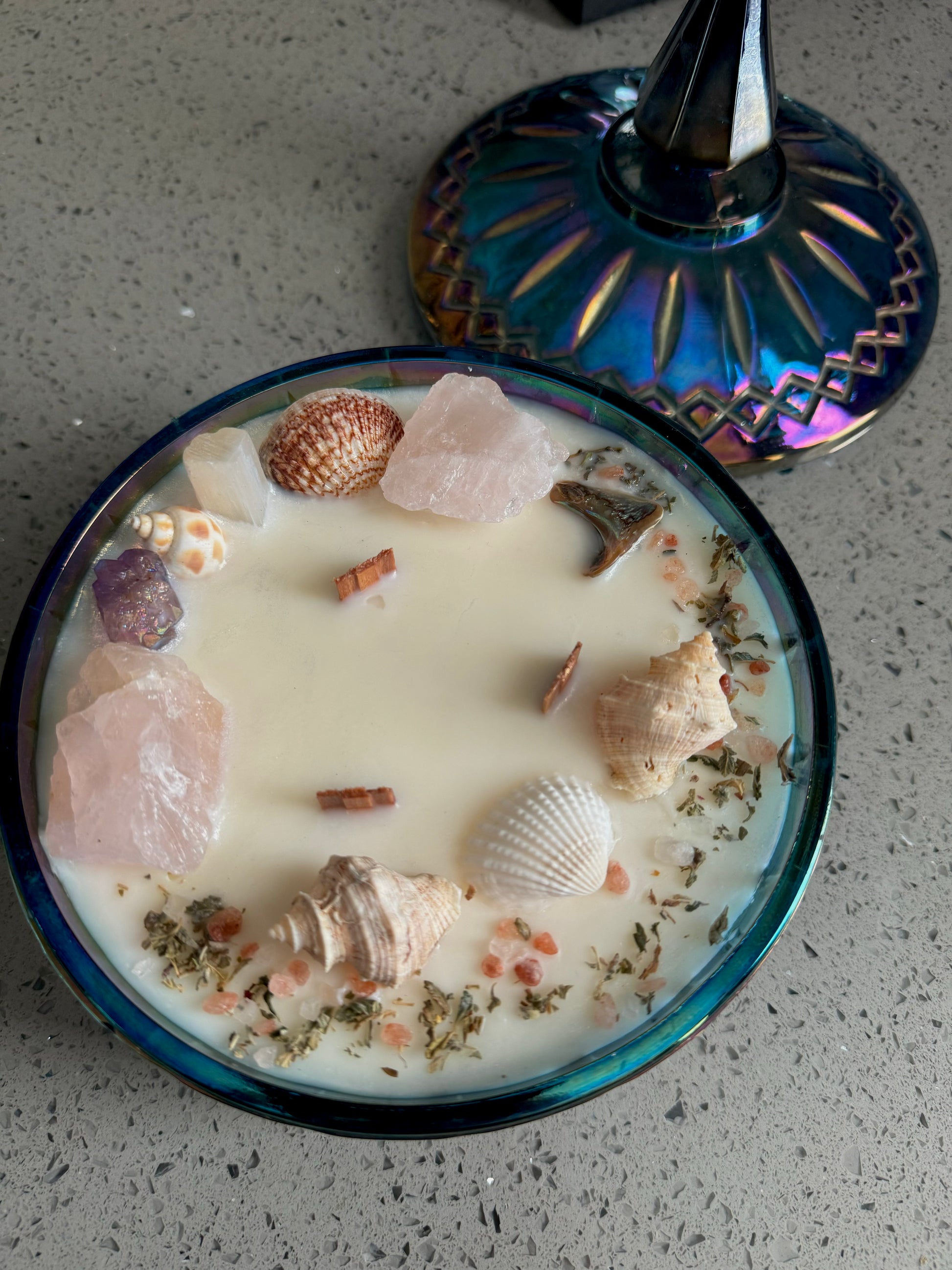 Experience a touch of elegance with this exquisite blue carnival glass candy dish from the 1960s. It is filled with a luxurious eco friendly candle that embodies acceptance, healing, and self love. The scent profile is a charming blend of sweet and floral notes.