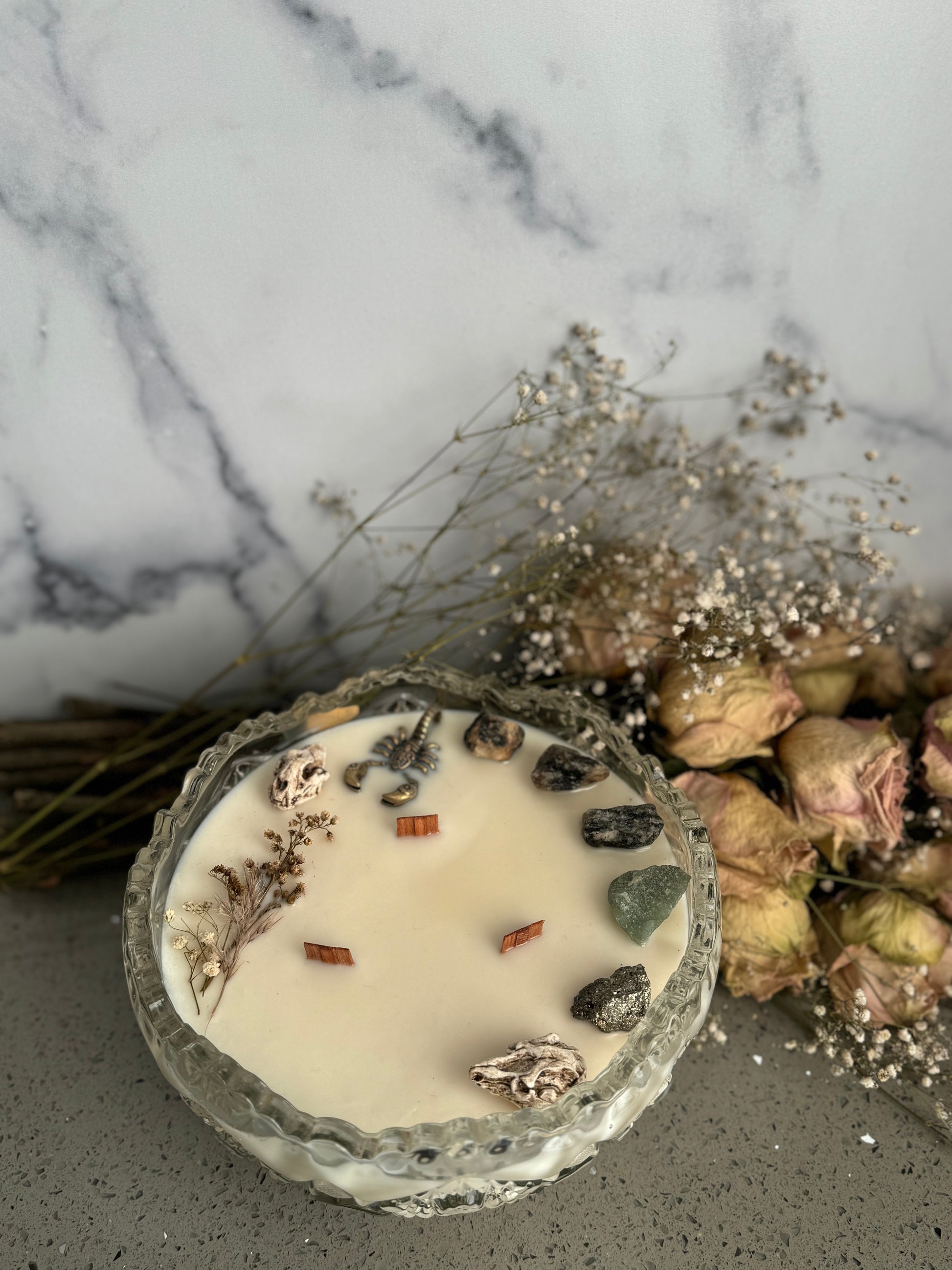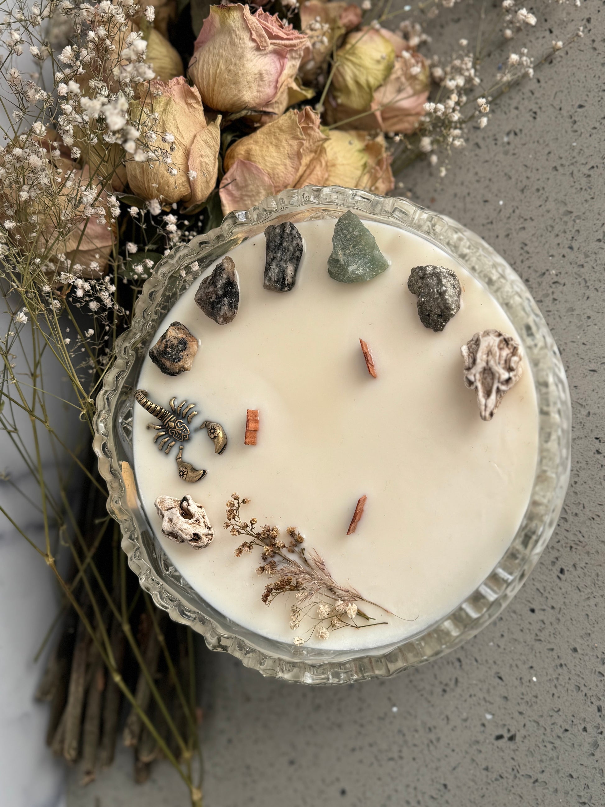 - Adornments: Surrounding the wicks are an array of enchanting stones and curiosities. Sodalite offers a calming energy, encouraging peace and harmony. Pyrite, known as "Fool's Gold," adds a touch of shimmering allure while symbolizing prosperity and protection. Aventurine, with its vibrant green hue, is a stone of luck, encouraging positive energy and growth. These elements are interspersed with little curiosities, each telling its own unique story, adding to the candle's allure.